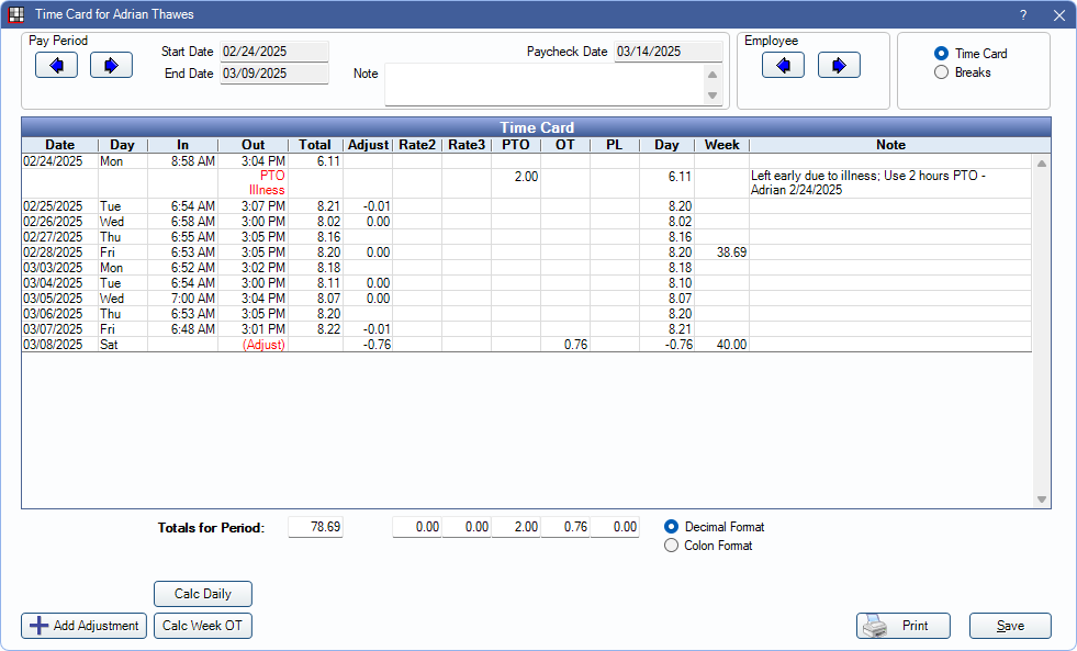- Includes excess time subtracted from the time card when breaks exceed 30 minutes and Calc Daily button makes adjustments if breaks over 30 minutes is checked in Time Card Setup and manual adjustments created using Add Adjustment button.