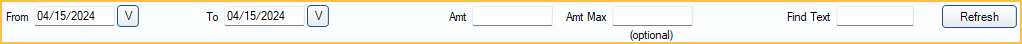 Amt: Search the Debit and Credit columns for a specific amount. If Amt Max is blank, this searches for the exact amount only. If Amt Max has a value, this becomes the minimum amount in the amount range.