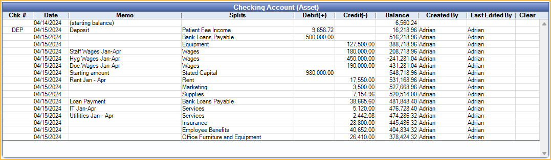 Click Refresh to update the transactions in the grid based on the selected filters. The title of the grid is based on the name and type of account (e.g., Checking Account (Asset) or Supplies (Expense)).
