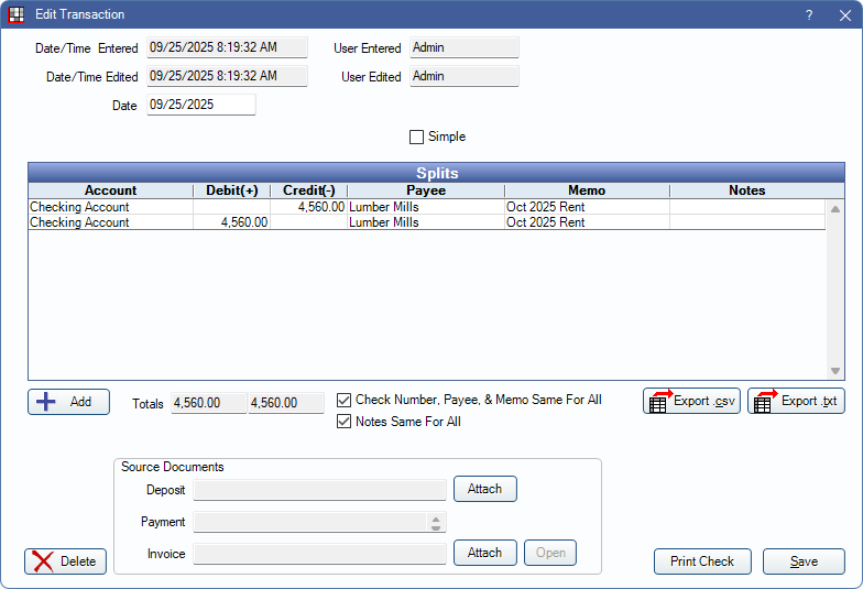 - Memo: Optional. Notes to identify this transaction. To enter a different memo for the Other Account, uncheck Simple.