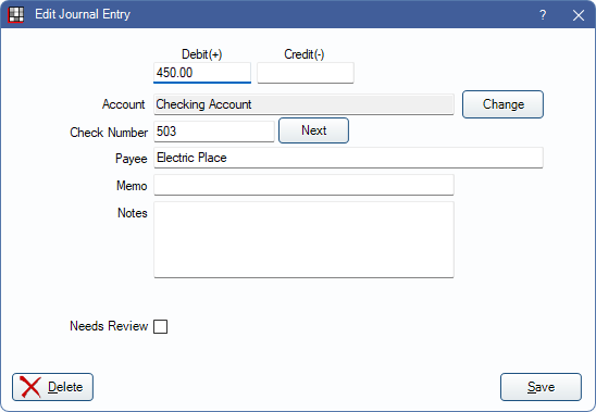 - Notes: Optional. Enter any notes about this transaction. Does not print on checks.