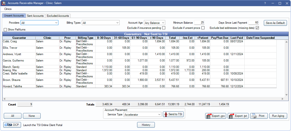 - Use Open Dental's Accounts Receivable Manager to identify overdue accounts and send them to TSI.