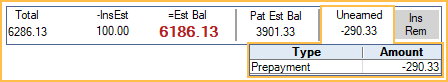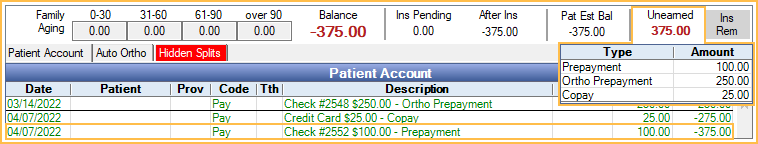 The payment will show as a credit line item in the Patient Account, affecting the patient's balance. The family's total unallocated amount will show under Unearned in the top aging bar. Hover over the total to view a breakdown of the family's unallocated, unearned balance. All unallocated prepayments within the family are summed by unearned income type. No breakdown is displayed if the total unearned balance is zero.