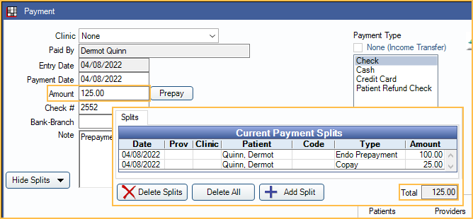 When Do Not Show in Account or on Reports is enabled for the Default treatment planned procedure unearned type, the payment will be hidden from the Patient Account tab and most reports, to not affect the patient balance until the treatment planned procedure is set complete. It is also excluded from the Unearned balance since it is already allocated. A summary of the prepayment can be viewed under the Hidden Splits tab. Once the procedure is set complete, the prepayment is transferred to the Patient Account with an automatic income transfer. Run the Hidden Payment Splits Report to track accounts with these prepayments.