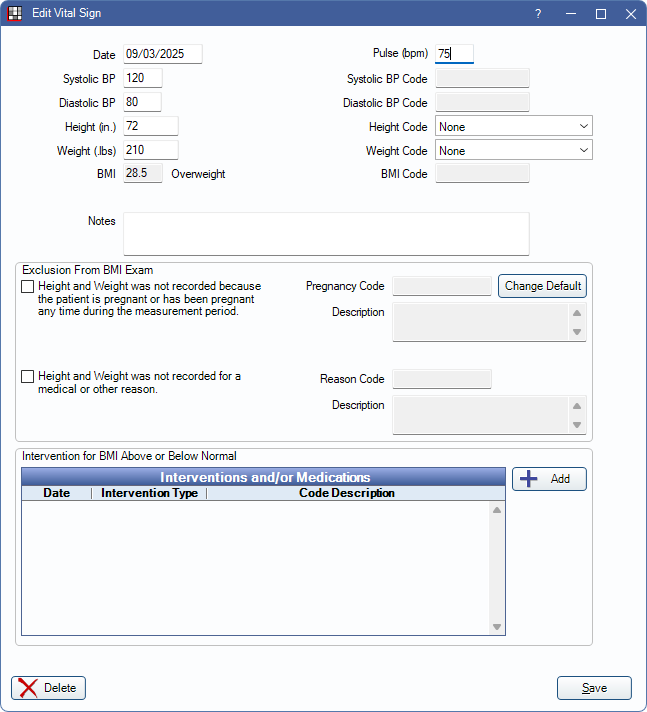 - BMI: Automatically calculated using height and weight. If BMI is flagged as underweight or overweight, and the patient is older than 18, an Intervention area shows at the bottom of the window. A corresponding LOINC code shows.