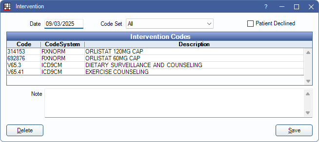 - Click on an intervention. To filter the list by intervention type, click the Code Set dropdown.