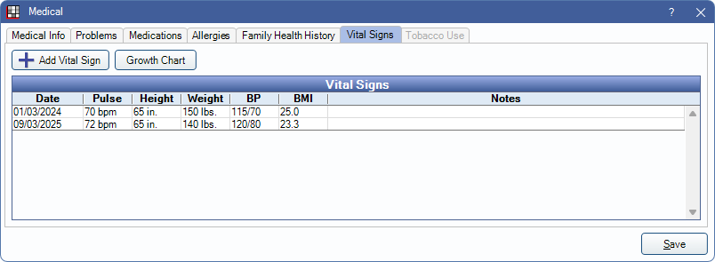 - Notes: Enter any notes pertaining to the patient's vital signs.