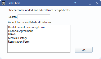 Only sheets with a type of PatientForm or MedicalHistory are listed. If there are no custom patient forms or medical histories, the internal versions show.