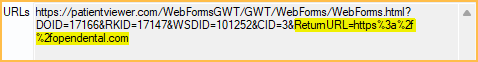 Redirect URL: When patients complete their forms, they can be automatically redirected back to the office website. Enter the full URL (e.g., https://opendental.com) where patients should be redirected to. The URLs area will update to include the redirect code.