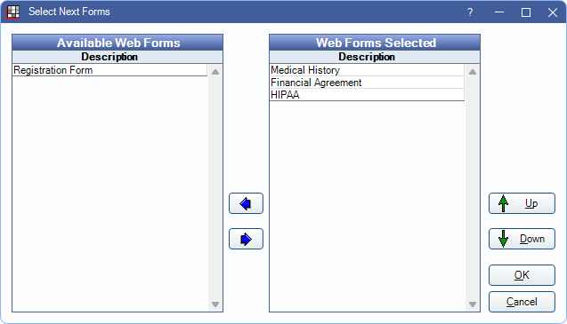Remove: Highlight a form, then click to delete it from the Available grid. The form will no longer be available for online use.