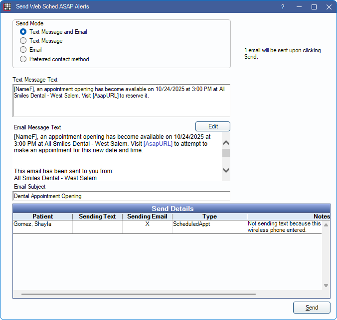 - Click Send. The Send Web Sched ASAP Alerts window opens.