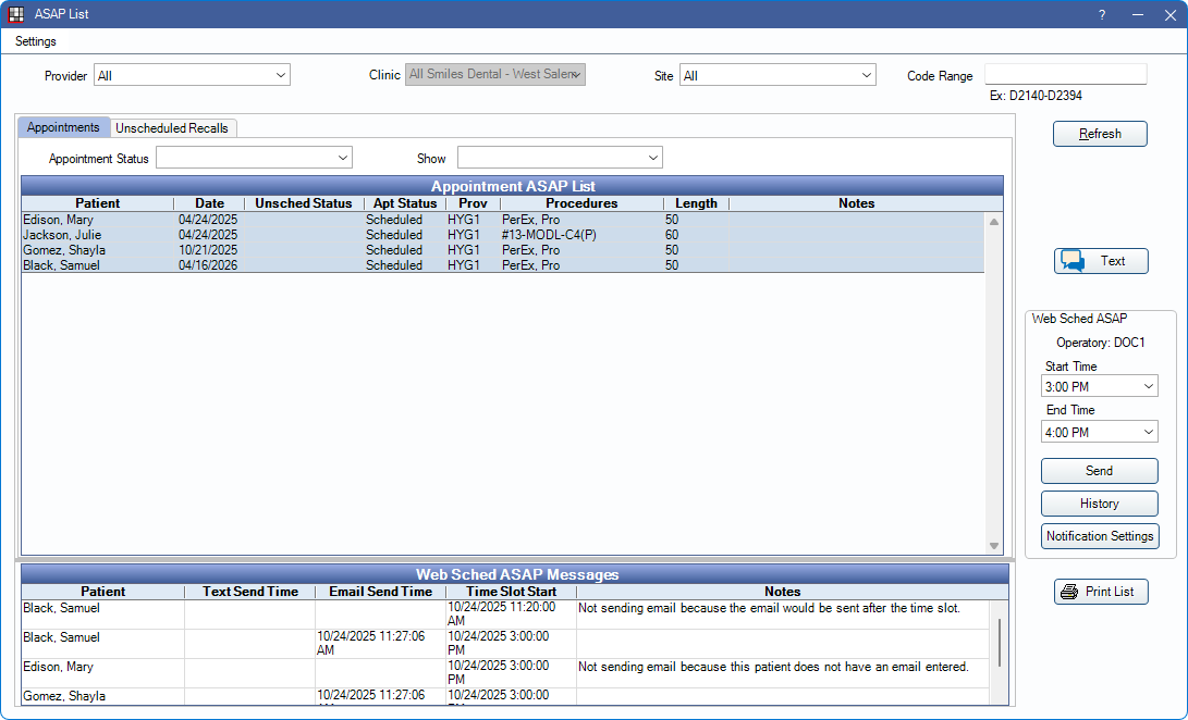 Use Web Sched ASAP to quickly send email and/or text messages to patients on the ASAP List about last minute appointment openings.