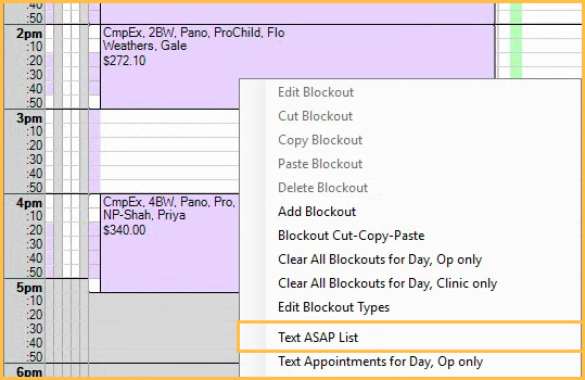- In the Appointments Module, right-click on the available time slot, then select Text ASAP List. The ASAP List opens.