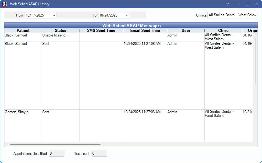 - Date Entry: The date and time a user clicked Send to send the Web Sched ASAP notification.