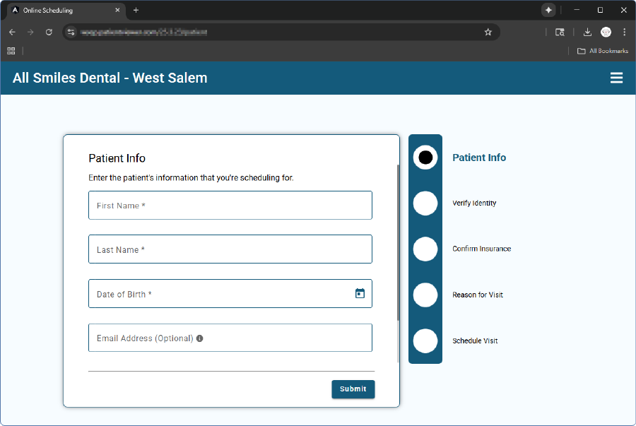 Web Sched Existing Patient can be opened on a new webpage, as shown below, or embedded onto the practice website.