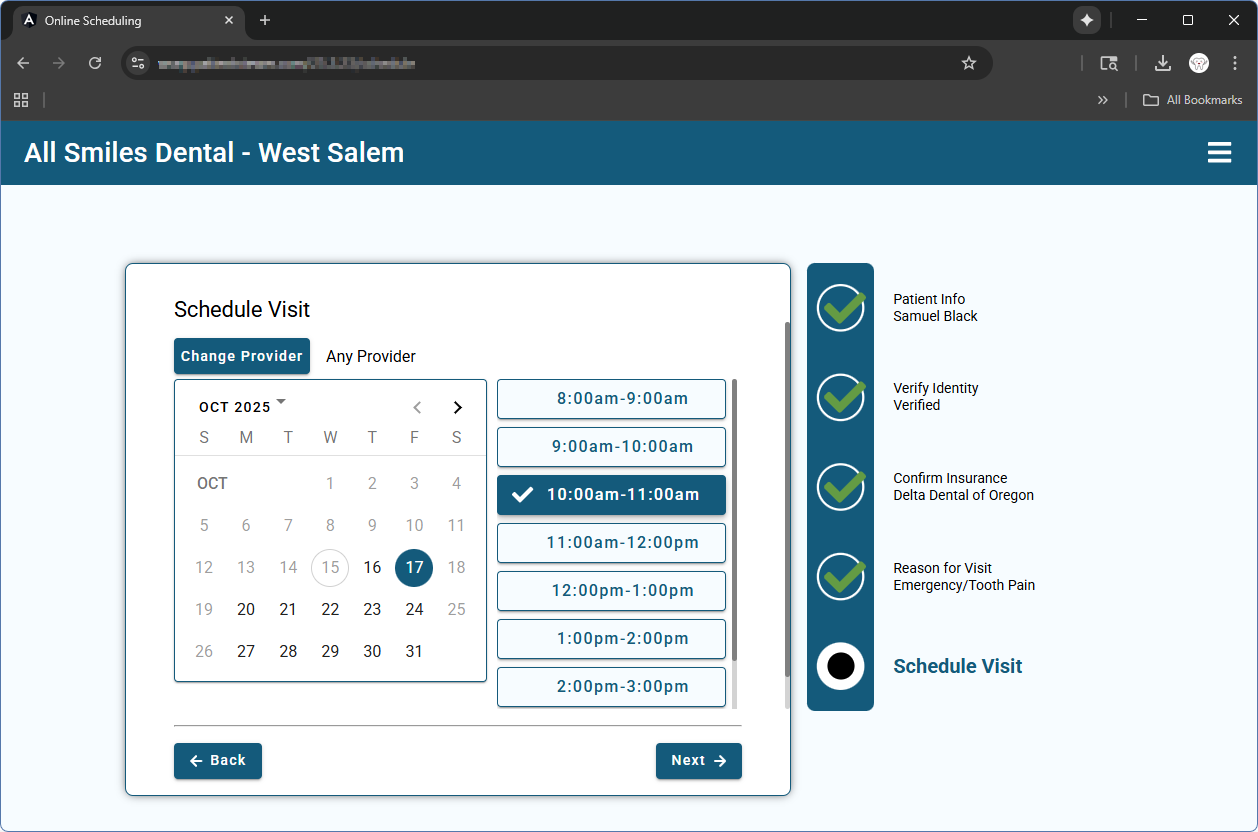 - Optionally, the patient can be routed to a Web Form after booking the appointment.