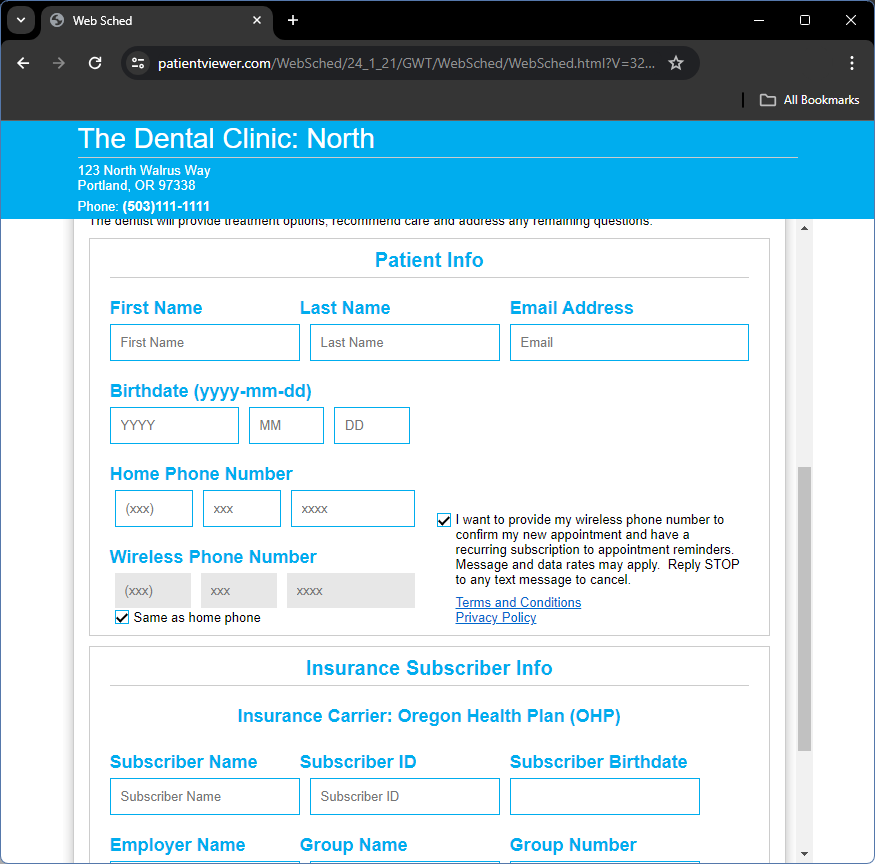 - By entering their phone number, the patient agrees to receiving text messages from the office. This sets Text OK and Appt Texts to Y (Yes) in the Edit Patient Information window.