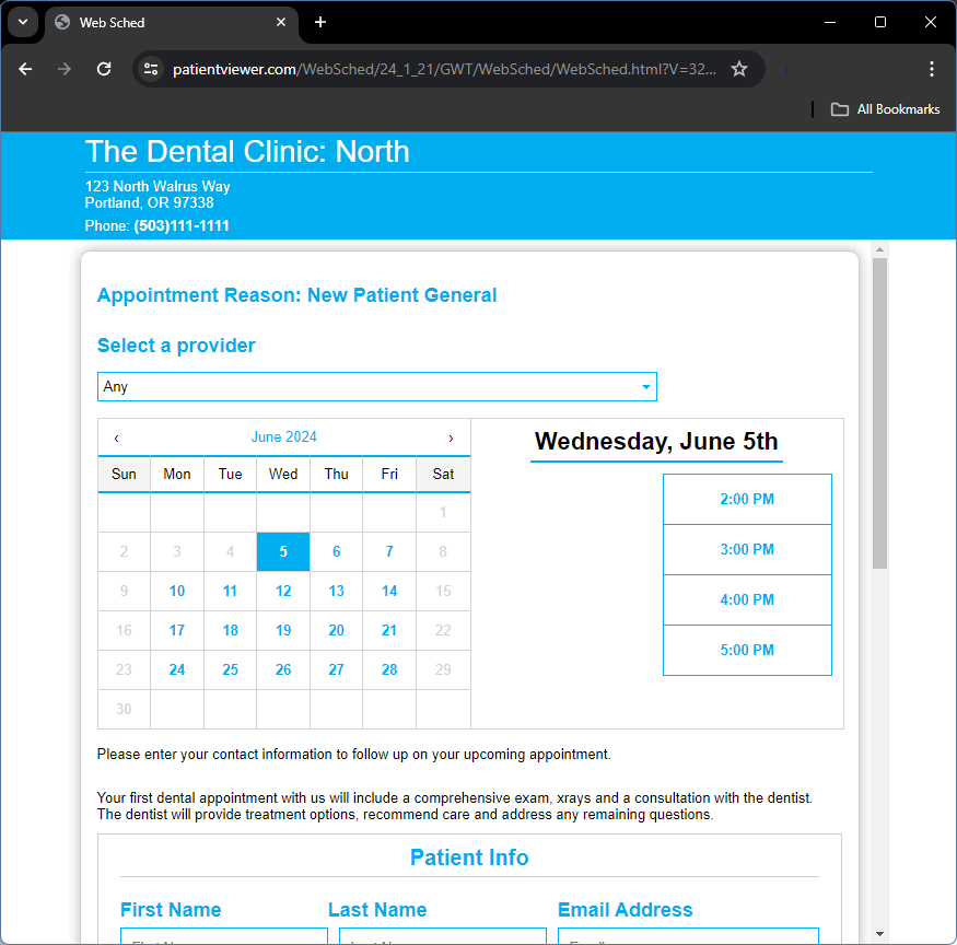 - This is only provided as an example of how the Patient Viewer can be embedded in a website to enhance its appearance. Open Dental is not able to embed or manage custom websites for a practice. Contact an IT professional or webmaster to embed Web Sched New Patient into the practice site.