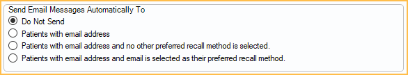 - Patients with email address and no other preferred recall method is selected: Only email automated recall reminders to patients with an email address and no other Preferred Recall Method.