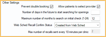 - Web Sched Recall Confirm Status: Select the confirmation status to apply to appointments scheduled using Web Sched Recall. To customize options, see Confirmation Status. Defaults to Created from Web Sched.