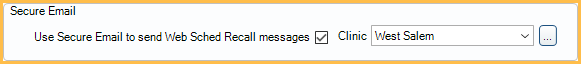Use Secure Email to send Web Sched Recall messages: Only available when Secure Email is enabled. Check send Web Sched Recall emails via Secure Email. Use the Clinic dropdown or click [...] to enable this setting for specific clinics.