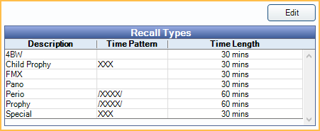 Recall types (prophy, childprophy, and perio) determine due date intervals and time pattern/appointment length.