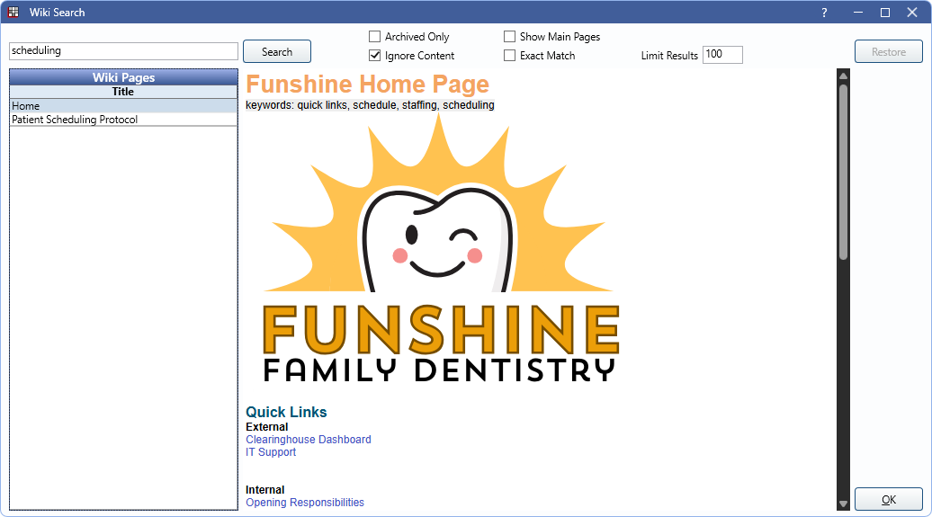 - Checked: Search results only include wiki pages with the term exactly as typed. For example, if searching "Training Employee", but the wiki is titled " New Employee Training", the wiki page would not be displayed. Searching "New Employee" would yield a result.