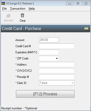 In the Payment window, in the Credit Card Payment area, click XCharge.