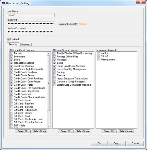 - For each clinic, create an XCharge user with user name and password and select the Processing Account (merchant account) to use with the clinic.