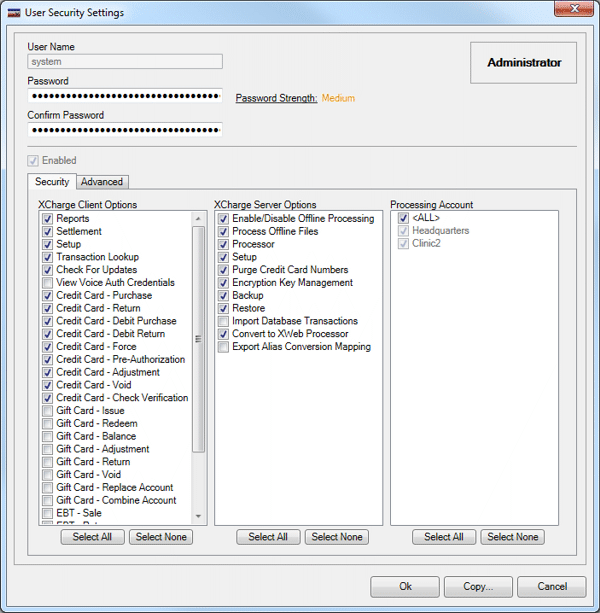 - One clinic user must be the XCharge Administrator. This user can process payments using any merchant account. We recommend assigning the Administrator user to the Headquarters clinic in Open Dental (see below).