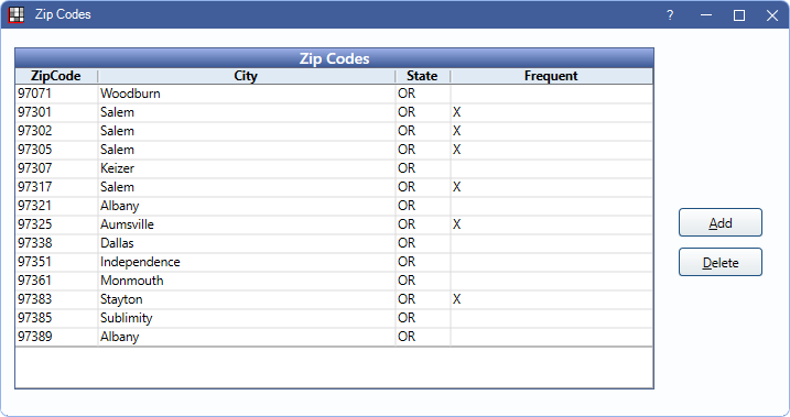 - Delete: Highlight a zip code from the list, then click to delete it.
