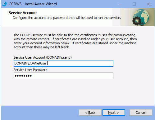 - Enter the Service User Account and password. For most users, this can be any user account. For users with CDA Digital IDs (i.e., provider certificates), this is the user that the certificates are installed to. Then click Next.