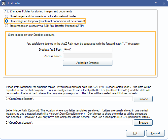 - Create a mirror copy of the A to Z folders in Dropbox, Apps, Open Dental. Refer to Dropbox Help Center for instructions.