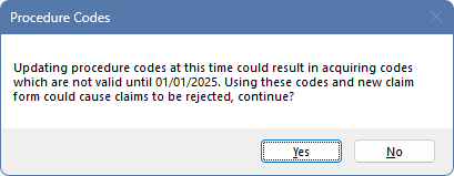 Solution: This message appears when running the D Code tool prior to the 1st of the new year. Claims may be rejected if new procedure codes are sent before they take affect. Click Yes to continue importing the new codes, or No to cancel.