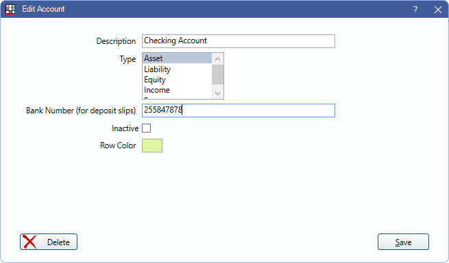 Delete: Removes the account. Accounts with transactions cannot be deleted.