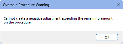 If the preference, Negative Adjustments, is set to Warn and the adjustment exceeds the estimated patient portion remaining, there is an Overpaid Procedure Warning instead. Users can choose to Cancel the adjustment or click OK to proceed with creating the adjustment.