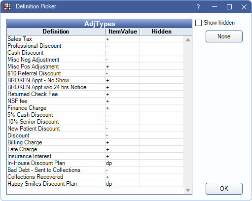 Subtractions: List of adjustment types that subtract the adjustment amount from the patient's account balance (issues a credit of production).