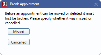 If the preference, Force users to break scheduled appointments before rescheduling, is enabled, when moving an existing appointment the the Pinboard, there is a prompt to break the appointment.
