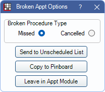If the Broken appointment procedure type in Preferences is set to anything other than None, when breaking an appointment using the toolbar, or Edit Appointment dropdown, the Broken Appt Options window opens.