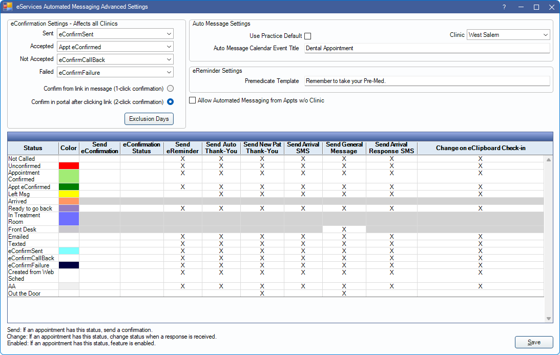 Determine if automated messages are sent for appointments with a specific appointment confirmation status. Many of these settings can also be set in Definitions: Appt Confirmed.