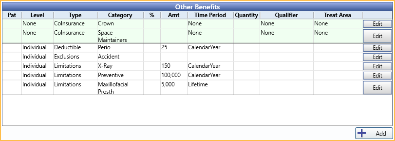 For benefits entered in this area to be functional, one of each e-benefit category must be assigned to an insurance category in Insurance Categories.