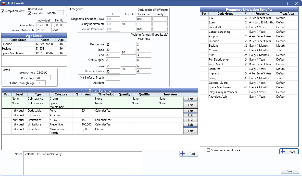 Lifetime Max: The maximum orthodontic benefit. This is separate from the individual and family Annual Max above as long as the insurance category spans are set correctly. The correct setup (and default) is to have an Ortho span of D8000 to D8999 and to exclude that span from the General category.