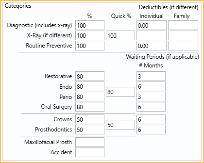 In the Categories area, set percentage benefits, deductibles, and waiting periods for default categories.
