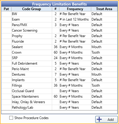 Any Code Groups that have been created are listed in the grid by default. Additional benefits can be created as needed. See Frequency Limitations for more detailed information.