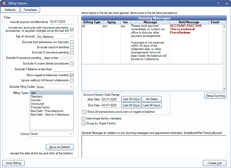 - General Message: Shows at the bottom of the statement in addition to dunning messages and appointment information. This text box supports Right-Click Options.