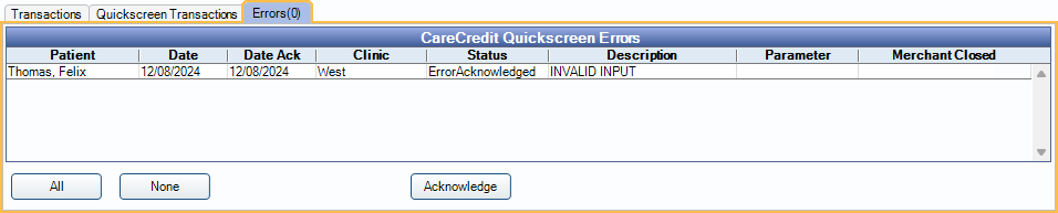 - When opened from the CareCredit Action window, only transactions for the selected patient show.
