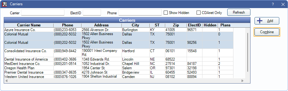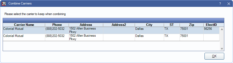 Combining carriers is useful when multiple versions of the same carrier have been inadvertently created. This can happen when carrier information is updated on the Edit Insurance Plan window instead of from the main list.