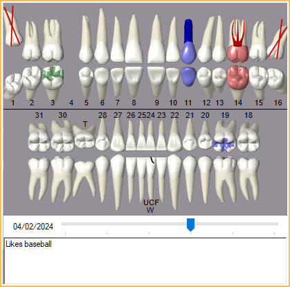 The Graphical Tooth Chart shows all restorative treatment that has been performed or is planned for the patient. Drag the slider bar under the tooth chart to view procedure changes to the tooth chart over time.
