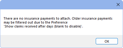 If the preference, Show claims received after days (blank to disable), is blank, users cannot finalize any $0 payments. Enter a number into this preference in order to finalize $0 insurance payments. Insurance payments can be finalized for the number of days entered into the preference.