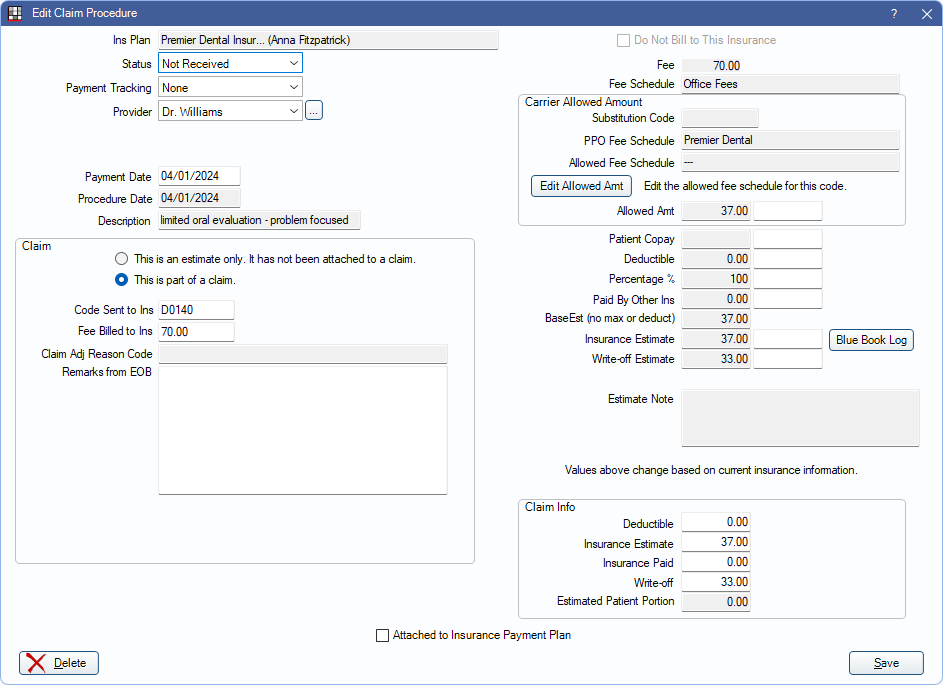 Ins Plan: Displays the insurance carrier and subscriber name. Claimprocs are always associated with one insurance plan whether they are an estimate or attached to a claim.